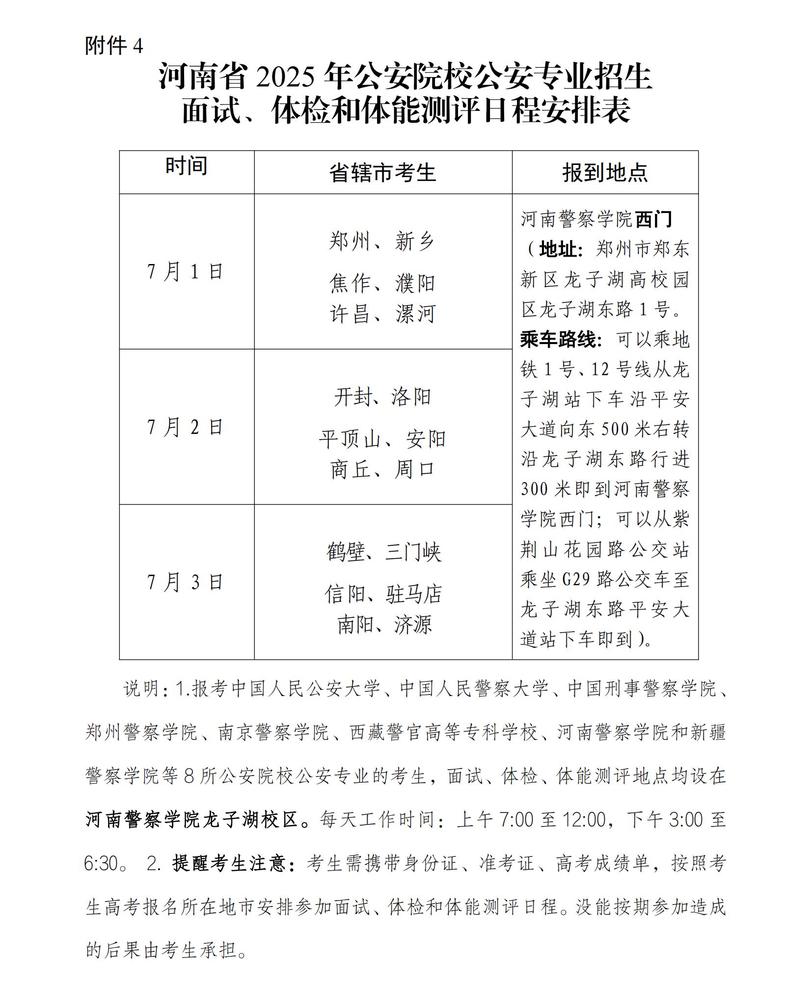 7月1日至3日,会统一安排面试,还会统一安排体检,并且会统一安排体能测评。地点是在河南警察学院。上午7时至12时是每日的工作时间之一,下午3时至6时30分也是每日的工作时间。考生需要严格按照高考报名所在地市的日程安排去参加。